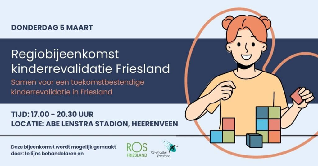 Hoe zorgen we ervoor dat kinderen in Friesland óók in de toekomst kunnen rekenen op sterke, toegankelijke en goed afgestemde kinderrevalidatie? Die vraag staat centraal tijdens de regiobijeenkomst kinderrevalidatie Friesland op donderdag 5 maart dat ROS Friesland samen organiseert met 1e lijns behandelaren en Revalidatie Friesland. Jouw expertise is daarbij onmisbaar.